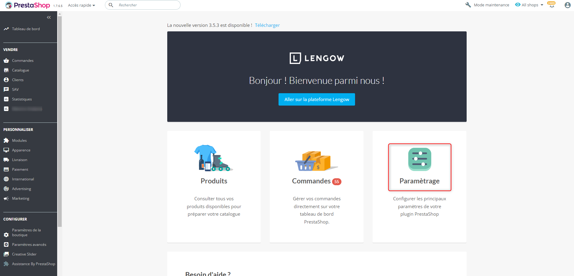 - Ensuite, sélectionnez "Paramétrage" sur la page principale de notre plugin Lengow.