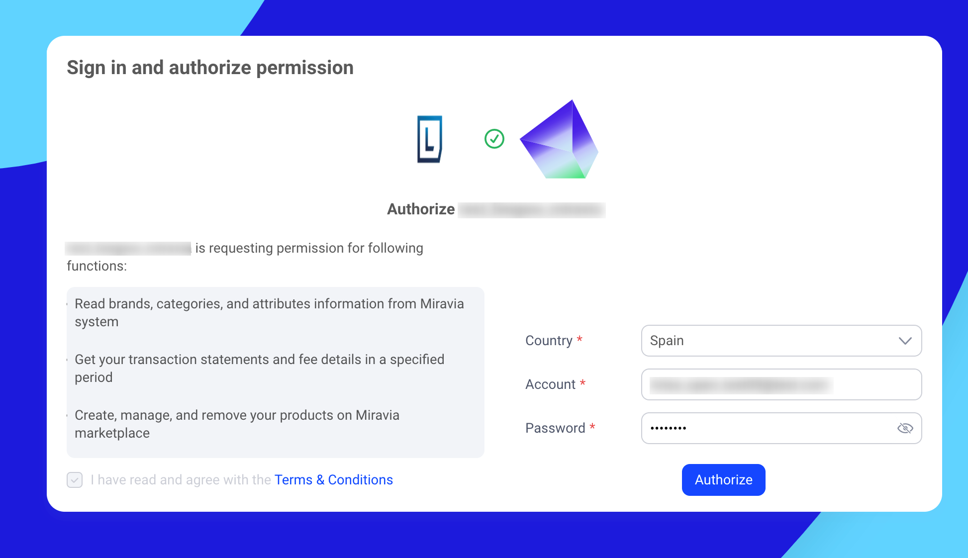 2) Vous serez redirigé vers la page d'autorisation de Miravia. Renseignez les détails de la connexion fournis par Miravia :