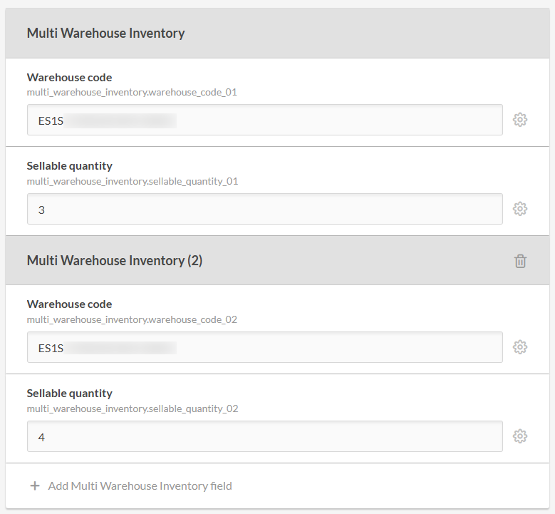 - Attributs "Multi-Warehouse Inventory" optionnel) : si vous utilisez plusieurs entrepôts, vous pouvez fournir pour chaque entrepôt son "Warehouse code" (code d’entrepôt, tel qu'il apparâit dans votre back-office Miravia) et la quantité en stock correspondante "Sellable quantity".
