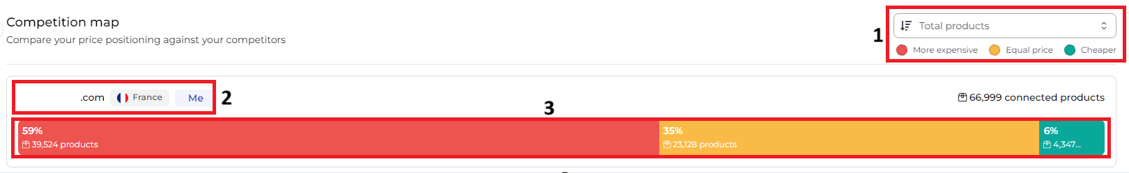 3. Positionnement des concurrents : Cette barre affiche le nombre total de produits connectés dans votre catalogue et illustre leur répartition des prix par rapport au prix moyen de tous les concurrents vendant les mêmes produits.