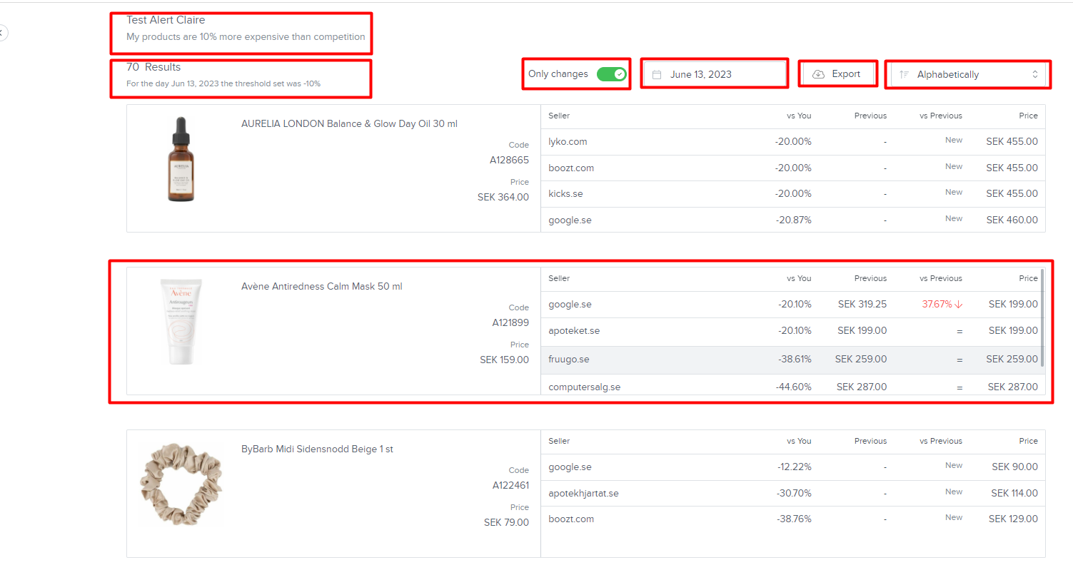 La notification par email reçue contient le nom de l'alerte et les critères inclus, ainsi que la liste des produits inclus dans celle-ci. Vous pouvez également voir les différences de prix par rapport aux concurrents que vous suivez. Vous pouvez consulter l'alerte complète et la modifier en cliquant dessus depuis la page des alertes.