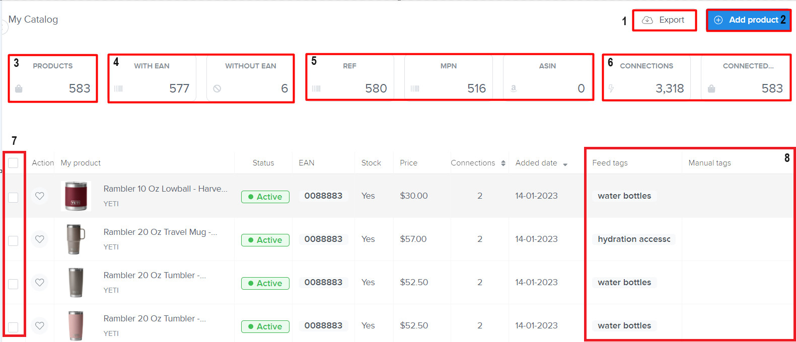 - EANs : Consultez la section de vos produits avec et sans EANs.