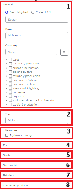 - Produit : Dans cette colonne, vous voyez les produits inclus dans votre catalogue. Vous pouvez toujours filtrer cette liste.