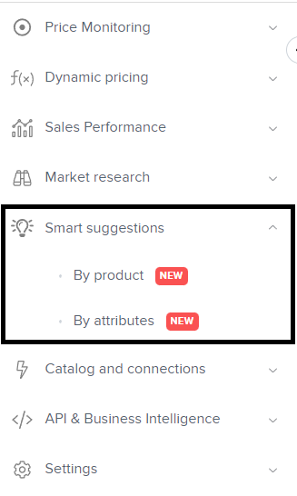 Le module de suggestions intelligentes génère des recommandations pour des correspondances potentielles basées sur différents attributs : Titre/Titre similaire, Photo, Référence (REF) et MPN. Peut être situé dans la barre latérale gauche comme le reste des modules :