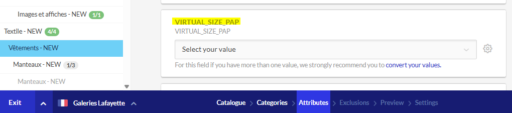 Afin de simplifier l'intĂ©gration des produits prĂȘt-Ă -porter, Galeries Lafayette met en place un nouvel attribut de taille : "VIRTUAL_SIZE_PAP", dans la catĂ©gorie "VĂȘtements NEW".