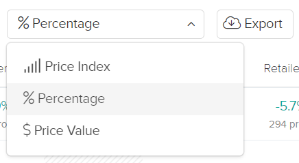 | En utilisant le menu déroulant Pourcentage , vous pouvez sélectionner comment les différences de prix sont affichées à travers les détaillants : par Indice de prix, Pourcentage et Valeur de prix. | |