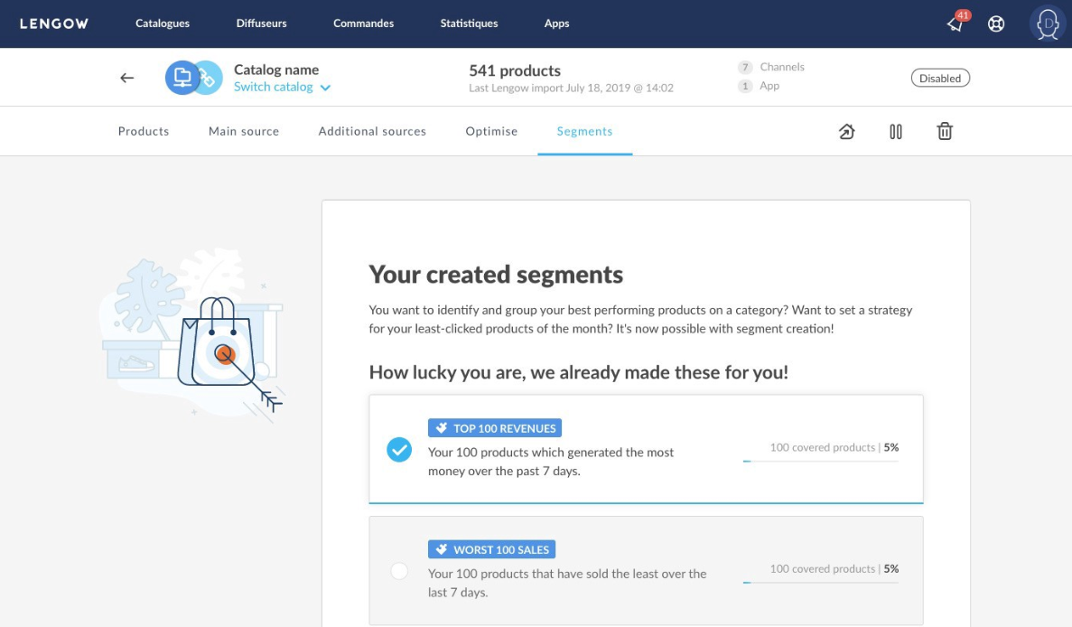 Des Segments suggérés en fonction de critères personnalisés issus de l'analyse de votre catalogue vous sont suggérés.