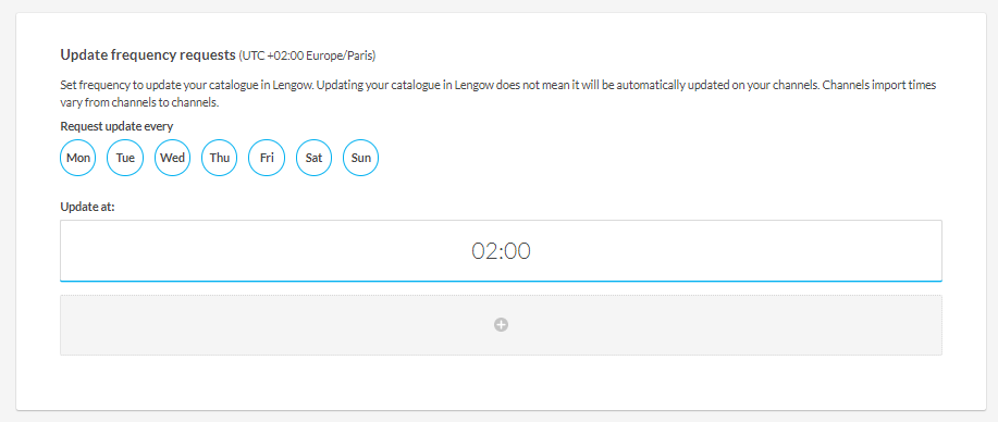La fréquence de mise à jour permet de choisir les jours et les horaires des importations de votre catalogue produits. Les données à jour seront alors disponibles pour les différents canaux associés à votre catalogue produits.