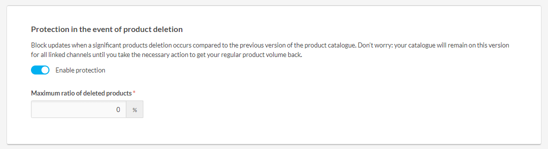 Ce paramètre permet de définir une protection en cas de suppression importante de produits par rapport à la version précédente du catalogue produits. Il est recommandé de fixer un ratio maximum de produits supprimés.
