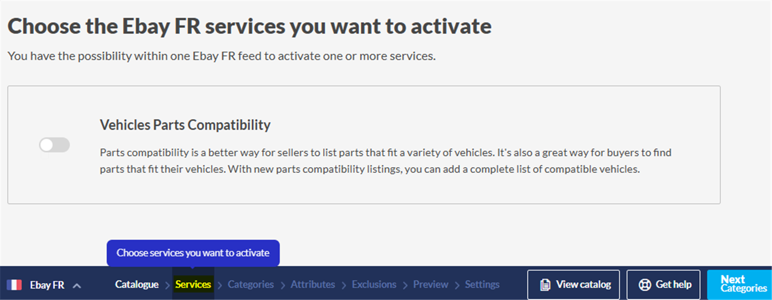 Certaines chaînes dans Lengow peuvent offrir des services spécifiques (par exemple, "Compatibilité des pièces de véhicules" sur eBay).
