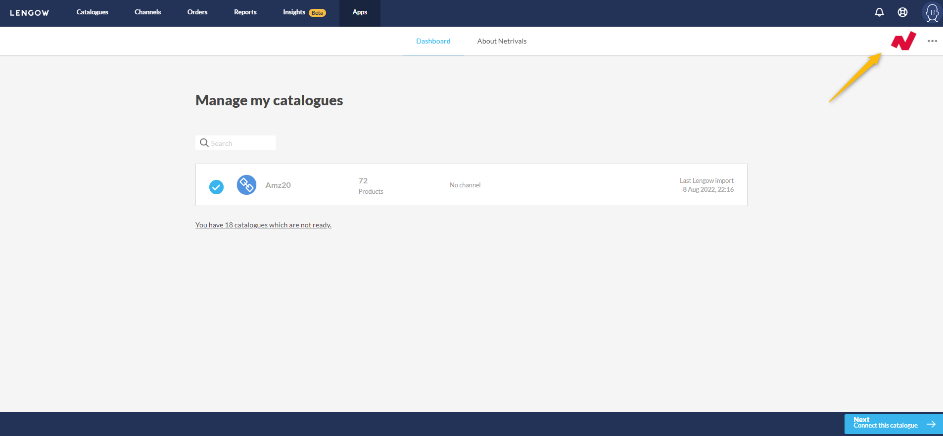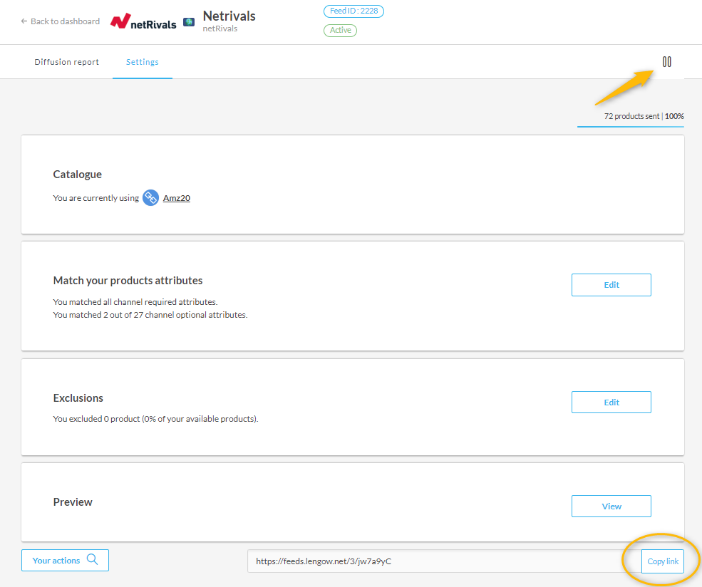 Une fois votre catalogue importé, il peut être utilisé comme tout autre type de catalogue importé dans Lengow. Il est facilement reconnaissable dans l'onglet canal par le sigle Netrivals.