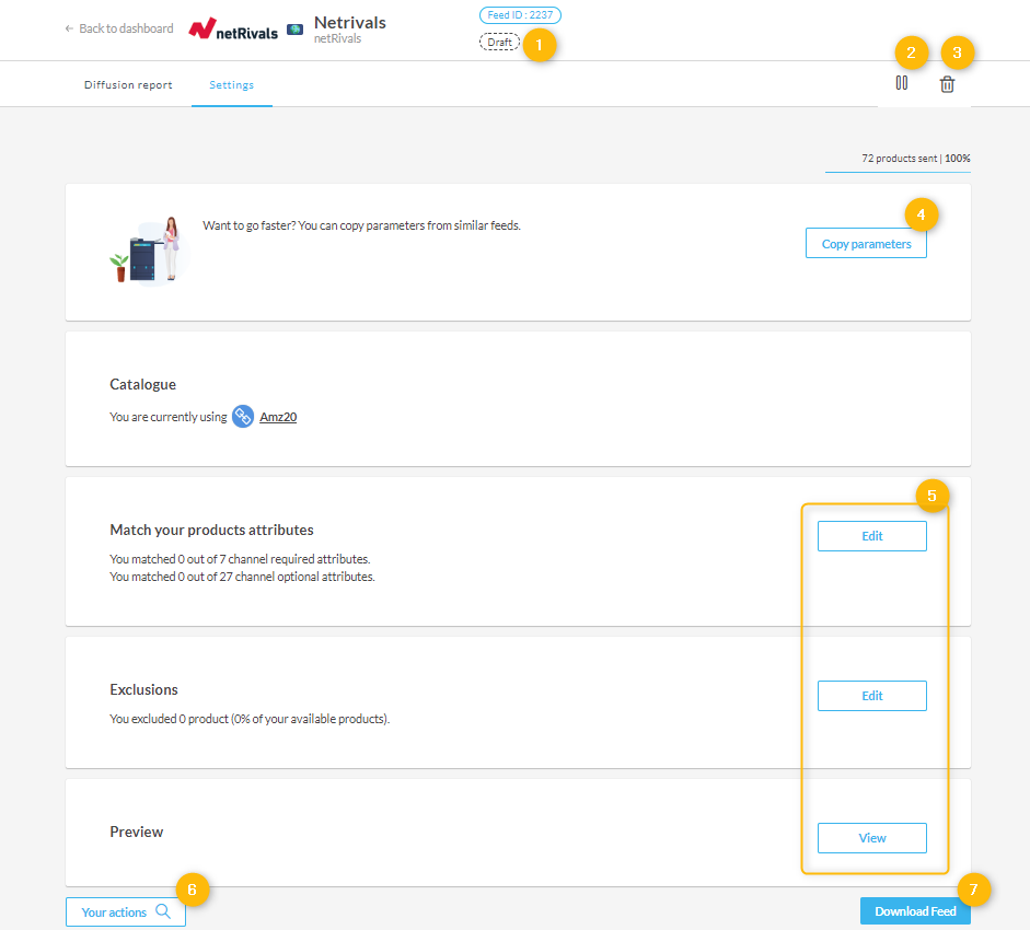 Copiez tous vos paramètres de catalogue, le mapping attributs, catégories, règles et exclusions.