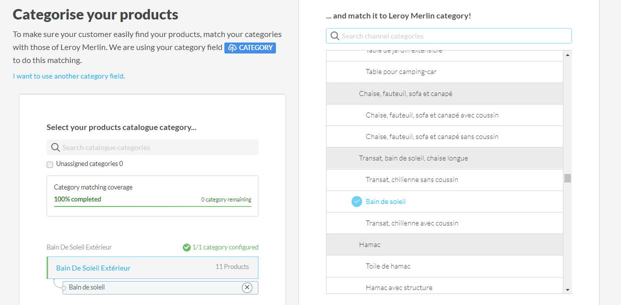 Faites correspondre vos catégories avec les catégories de Leroy Merlin à l'étape mapping Catégories.