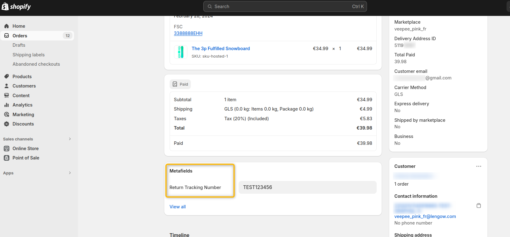 Quando modifichi un ordine, inserisci il numero di tracciamento del reso nel Metafield corrispondente: