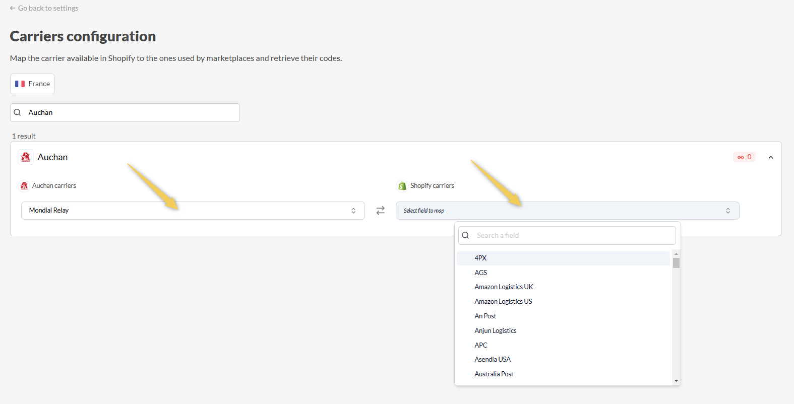 - Usa la barra di ricerca per trovare il marketplace dove devi mappare i corrieri.