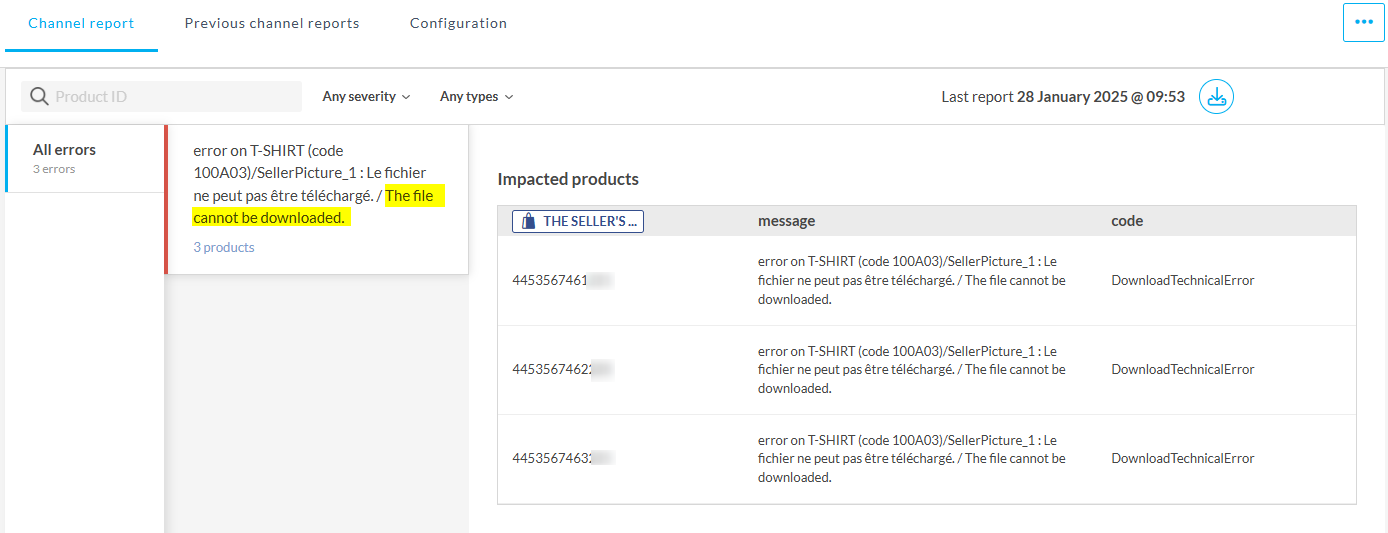 Ogni venditore ospita le proprie immagini su un server. Tuttavia, se il server non è nella whitelist (autorizzato) da Cdiscount, la piattaforma bloccherà il download dell'immagine, portando a questo errore.