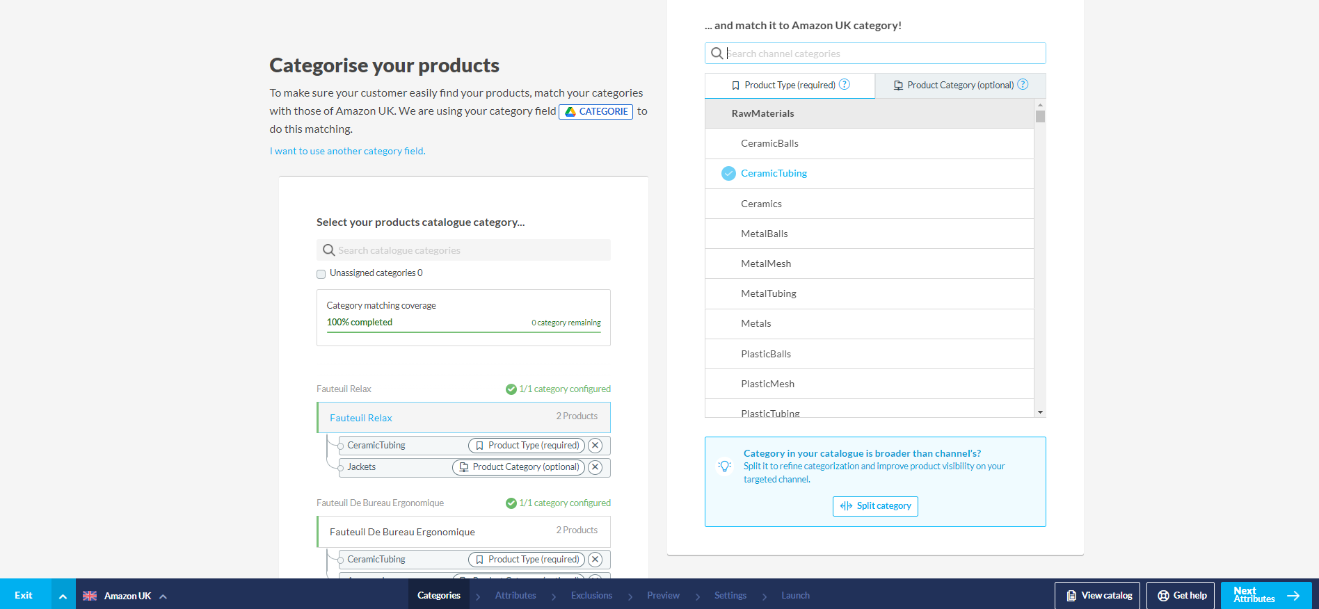 In un caso del genere, Lengow offre l'opzione di affinare la categorizzazione dividendo la tua categoria, al fine di distribuire i tuoi prodotti in diverse categorie del canale.