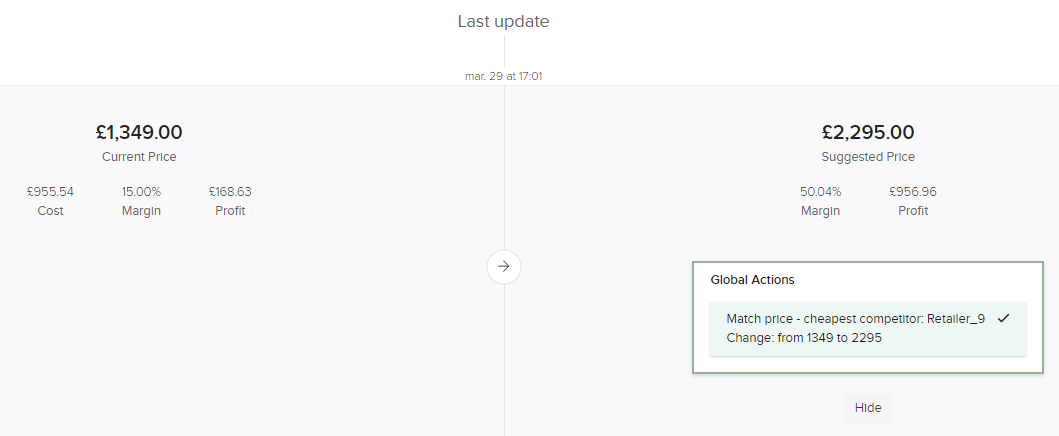 - Se fai clic su Dettagli, vedrai quali regole sono state applicate per calcolare quel specifico suggerimento di prezzo. Allo stesso modo, qui troverai perché alcuni prodotti non hanno prodotto alcun suggerimento di prezzo.