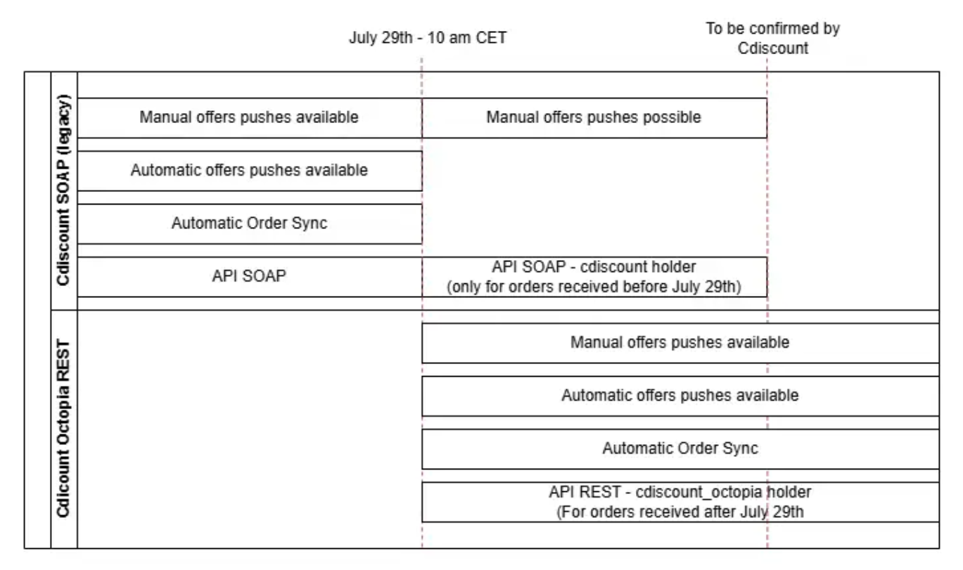 Cdiscount sta passando alla API REST di Cdiscount (Octopia). Questa migrazione è obbligatoria per continuare a pubblicare prodotti, aggiornare offerte e gestire ordini sulla piattaforma. Durante la prima fase, Cdiscount ha migrato i feed di prodotto nell'ambiente Octopia.