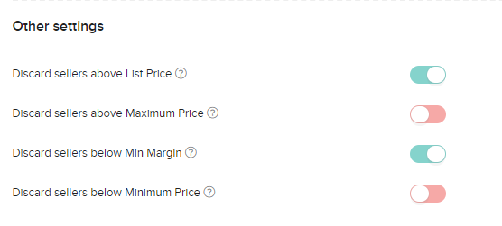 - Scarta i venditori sotto il prezzo minimo: Richiede di avere un prezzo minimo aggiunto al file di alimentazione definito da te stesso. Quando l'impostazione è attiva, tutti i venditori sotto questo prezzo vengono scartati dal calcolo e non considerati nel Dynamic Pricing.
