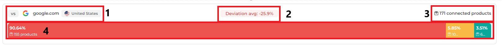 3.Barra di distribuzione del prodotto: Questa rappresentazione visiva mostra quanti dei tuoi prodotti hanno un prezzo superiore, uguale o inferiore al MSRP rispetto al numero totale di prodotti collegati. Questo ti aiuta a valutare rapidamente la tua strategia di prezzo su tutto il tuo catalogo.