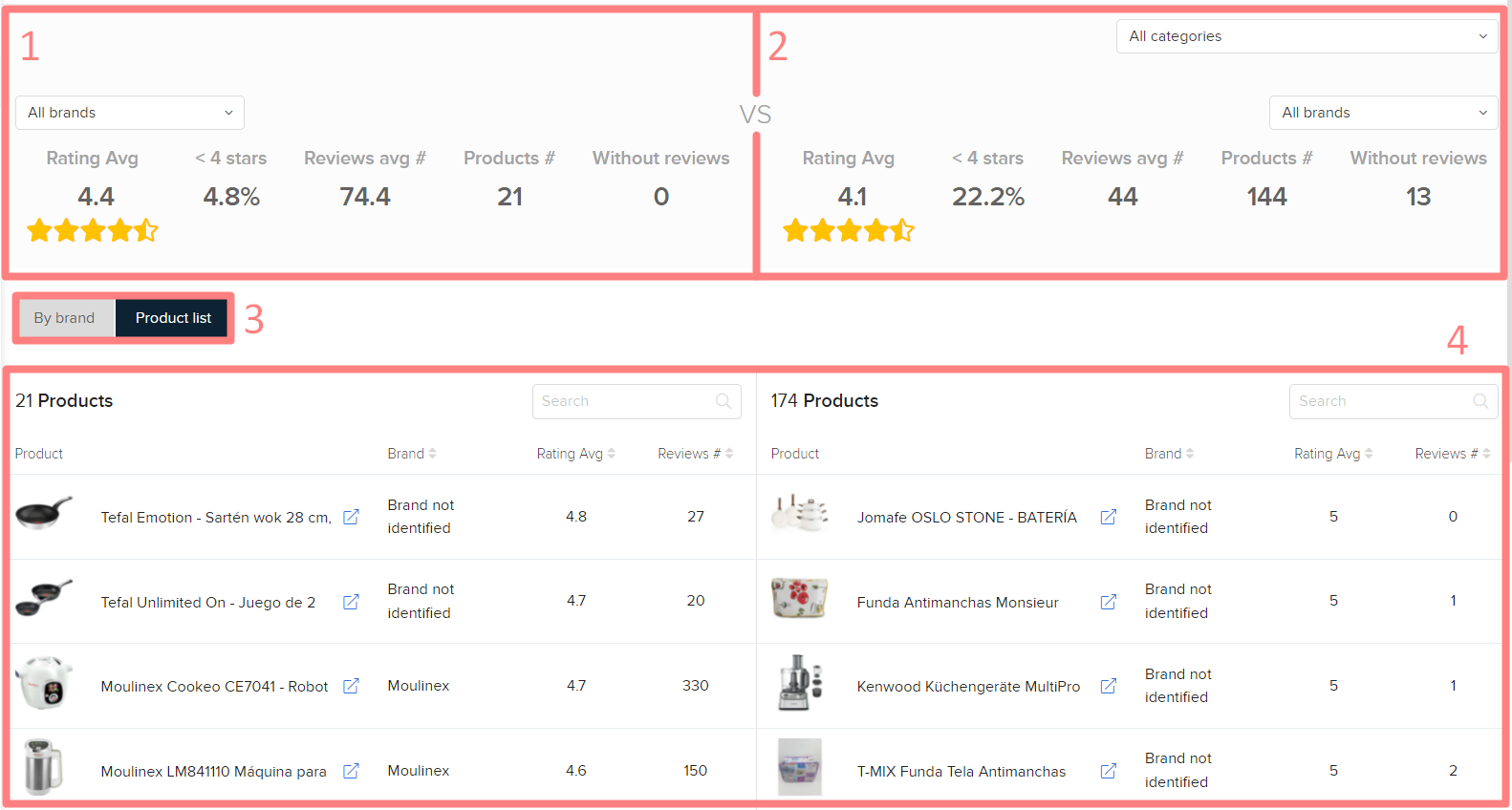1. Panoramica delle valutazioni e delle recensioni dei tuoi prodotti. Qui vedrai la media delle valutazioni di tutti i tuoi prodotti su Amazon, quale percentuale di essi è valutata con meno di 4 stelle, la media delle recensioni (tutte le recensioni divise per il numero di prodotti), il numero totale di prodotti e quelli senza recensioni. Puoi filtrare per marca per vedere informazioni specifiche.
