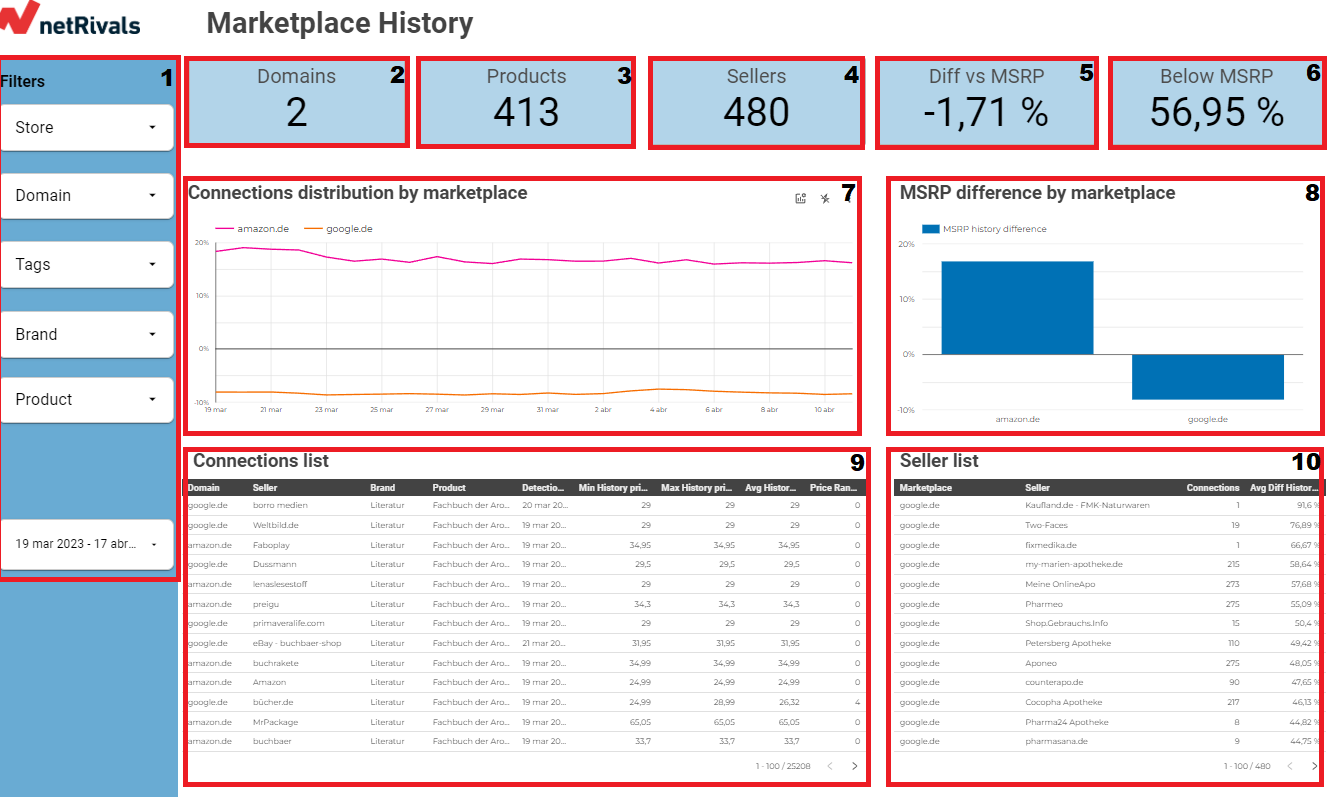 e. Prodotto: Filtra i diversi prodotti collegati nei marketplace.