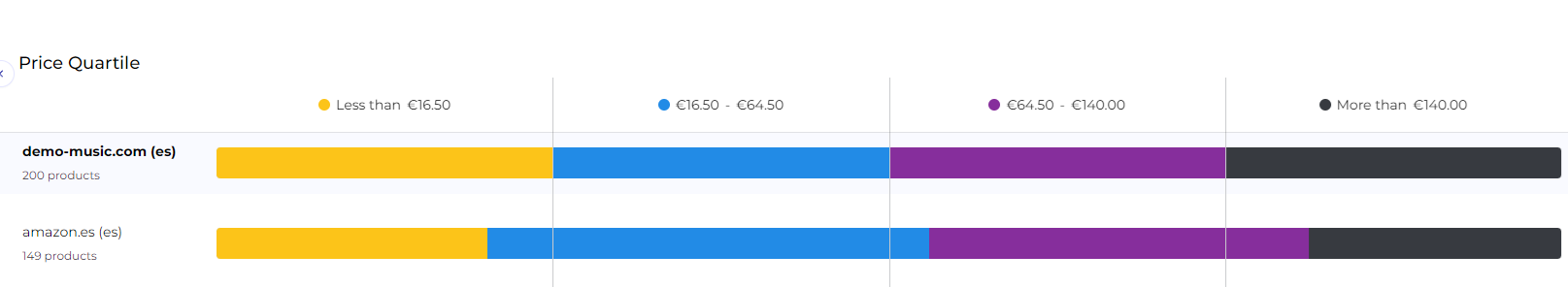 Questo grafico fornisce preziose intuizioni sulla distribuzione dei prezzi sia del tuo catalogo che dei tuoi concorrenti. Analizzandolo, puoi facilmente identificare se altri venditori offrono prevalentemente prodotti di fascia alta, di fascia media o di fascia bassa. Queste informazioni sono fondamentali per posizionare strategicamente i tuoi prodotti e possono aiutarti a individuare opportunità per regolare i tuoi prezzi, puntare a diversi segmenti di mercato o sfruttare le lacune nel catalogo della concorrenza.