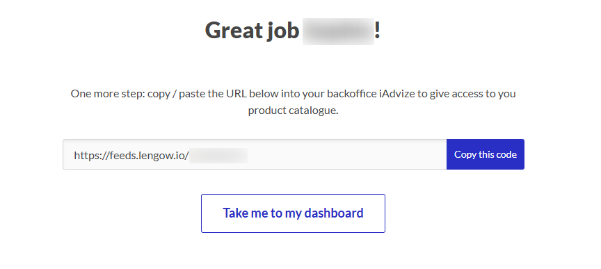 Apparirà un prompt di conferma: fai clic su "Avvia ora" per procedere. - Lengow genera un URL del feed specifico per il tuo feed iAdvize. Fai clic su "Copia questo codice" per copiare il link dell'URL, e salvalo per usarlo nella piattaforma iAdvize.