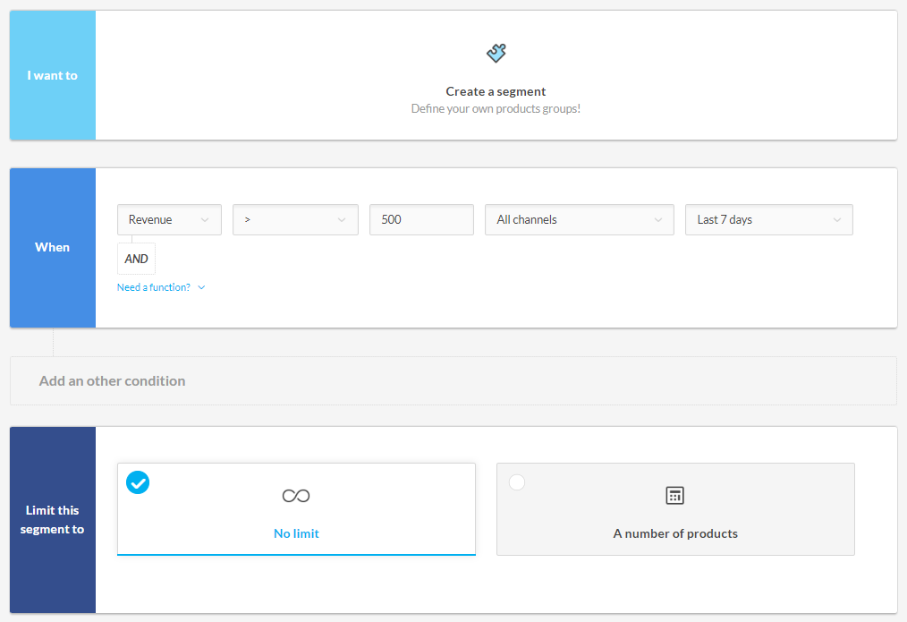 Ex: Voglio raggruppare tutti i miei prodotti che hanno generato oltre 500€ negli ultimi 7 giorni su tutti i canali.