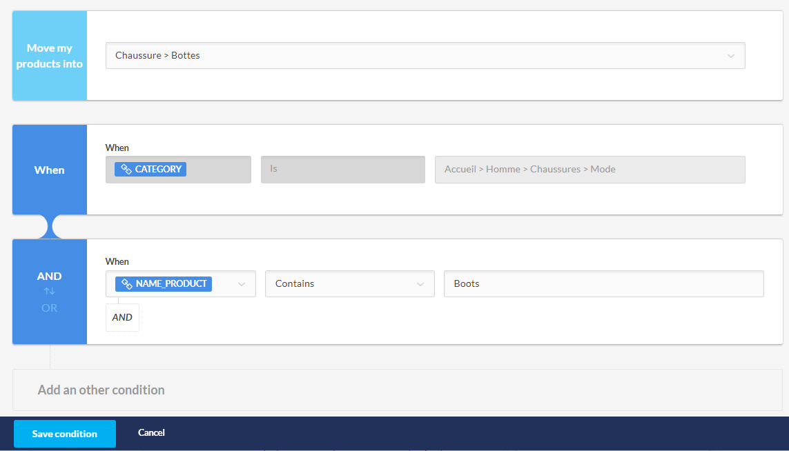 - E applica una condizione (regola) per selezionare questi prodotti(più info sulle condizioni qui). Esempio: Quando "titolo" contiene "Stivali".