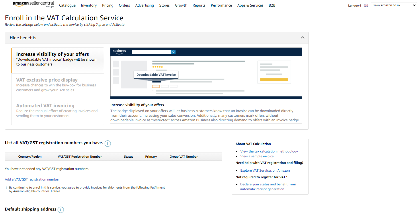 Amazon offre un servizio di gestione dell'IVA chiamato VCS (VAT Calculation Service), che può essere attivato dal tuo account venditore Amazon.