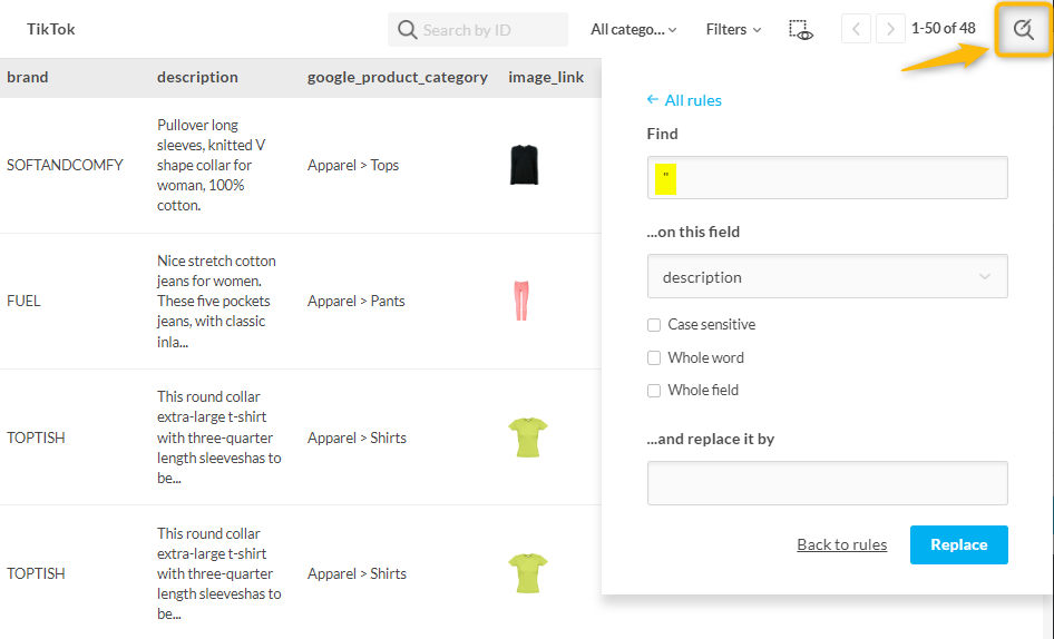 Per rimuovere facilmente le virgolette in Lengow, vai alla sezione Anteprima del tuo feed. Poi, aggiungi una nuova regola Trova & Sostituisci (vedi screenshot sotto) per sostituire " con nessun valore nel campo descrizione. Una regola simile può anche essere aggiunta per il campo titolo.
