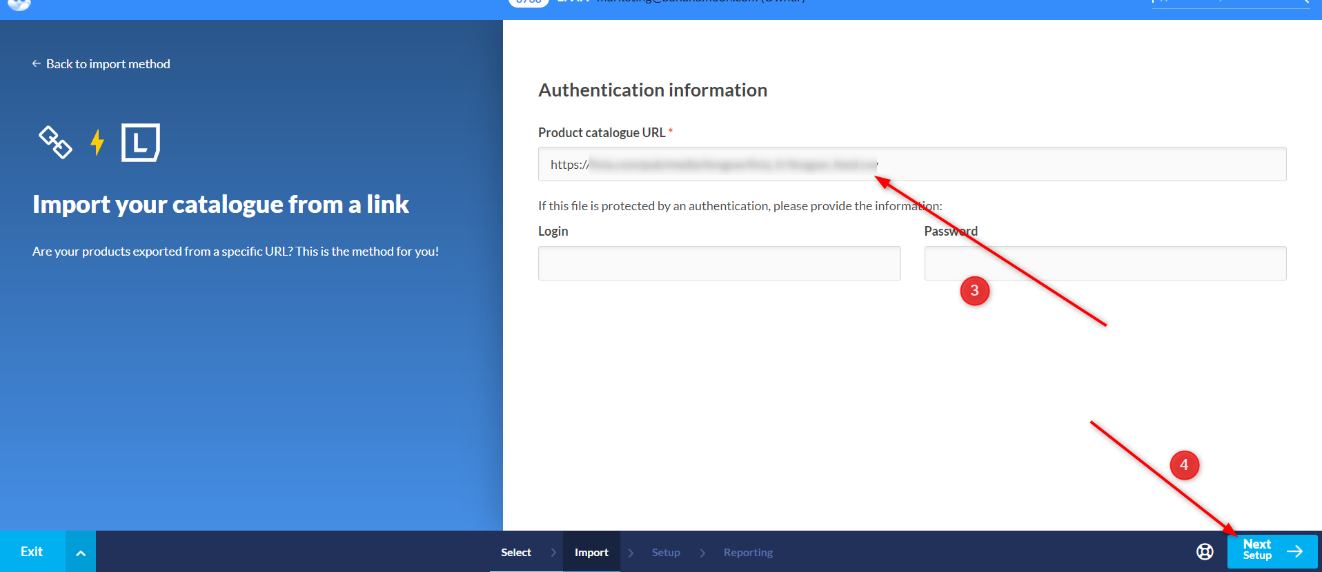 - Sostituisci l'URL corrente con il nuovo URL (Se il catalogo è protetto da un login e una password, inserisci le informazioni richieste su questa pagina), poi clicca sul pulsante "Prossima configurazione" :