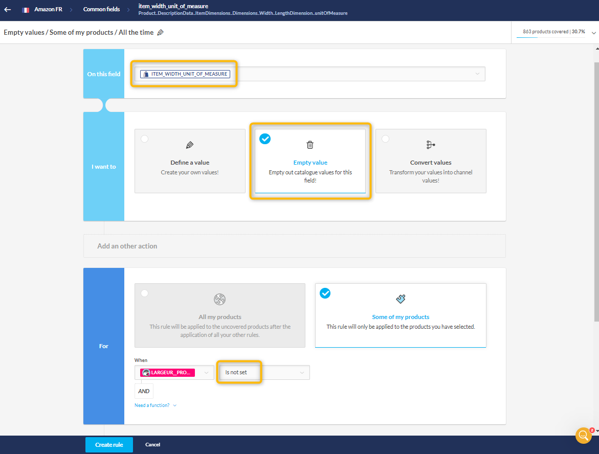 In questo esempio, aggiungi una regola per svuotare l'attributo "item_width_unit_of_mesure" quando il campo corrispondente all'attributo "item_width" non ha valore.