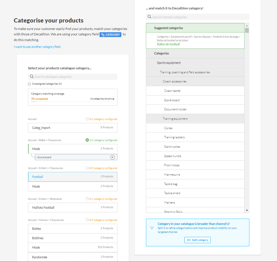 Applicable products: Netmarkets 迪卡侬(Mirakl)- 类别 将您自己的类别与Decathlon的类别在 类别匹配 步骤中匹配。 更新 2024年05月23日 08:41
