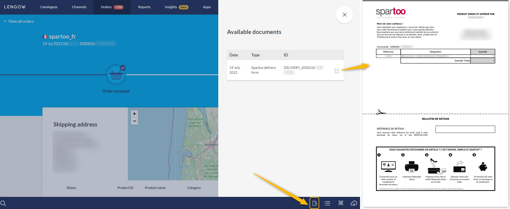 Spartoo的送货单在Lengow平台的订单详情页面上可用,如下图所示(点击放大):