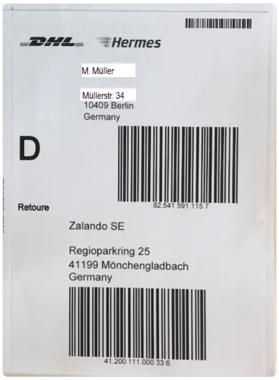 必须在包裹内附上预付且预先打印的退货标签,以便客户能够轻松且免费地退货。Zalando 建议使用自粘退货标签。