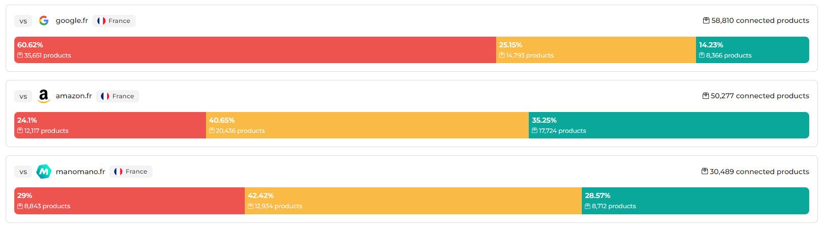 3. 竞争对手定位:此栏显示了您目录中连接的产品总数,并说明了它们的价格分布与销售相同产品的所有竞争对手的平均价格相比。