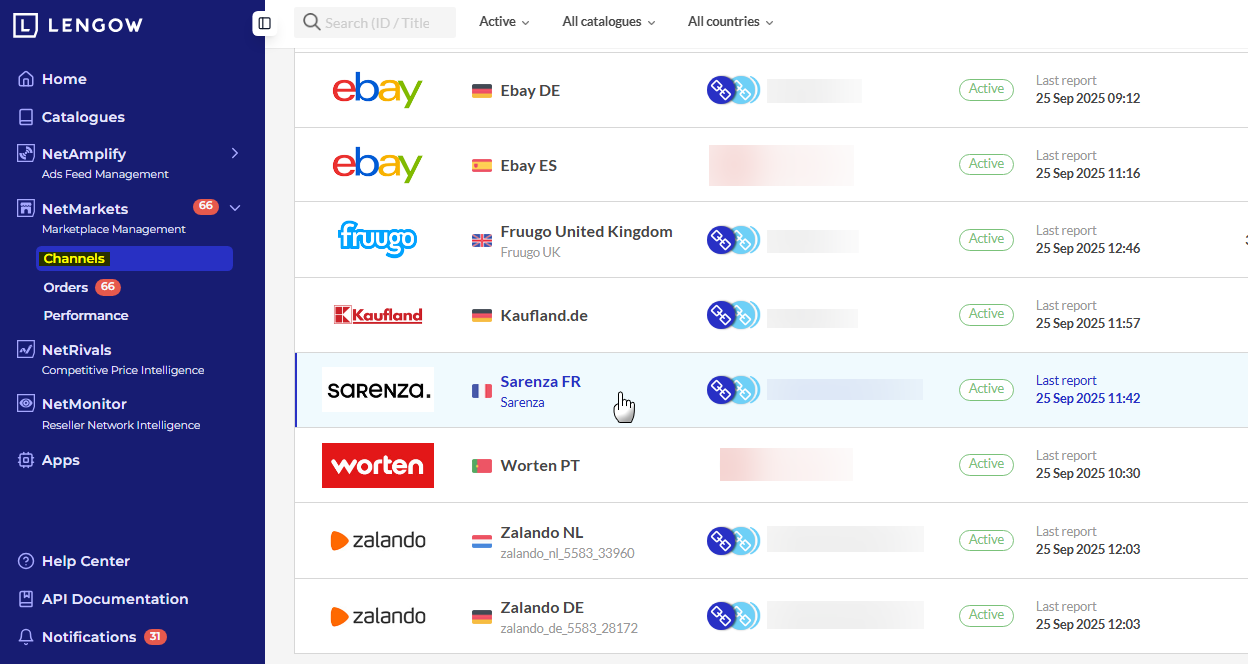 Applicable products: Netmarkets, Netamplify 💡 如何禁用渠道? 要在Lengow上禁用(临时或永久)渠道,请按以下步骤操作:1. 选择您想要禁用的渠道进入“渠道”,选择要禁用的渠道: 2. 点击“更多操作”-> “暂停此渠道” -> “禁用”要重新启用该渠道,点击“更多操作”-> “激活此渠道”禁用后,如有需要,您可以永久删除该渠道——但您将丢失所有设置和数据。操作方法是,点击“更多操作”-> “删除此渠道”,然后输入“I AM SURE”。 更新 2025年09月25日 14:37
