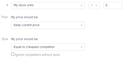 如果我的产品库存少于5个单位,那么我的价格应该是相同的,如果不是,那么我应该是等于最便宜的竞争对手。
