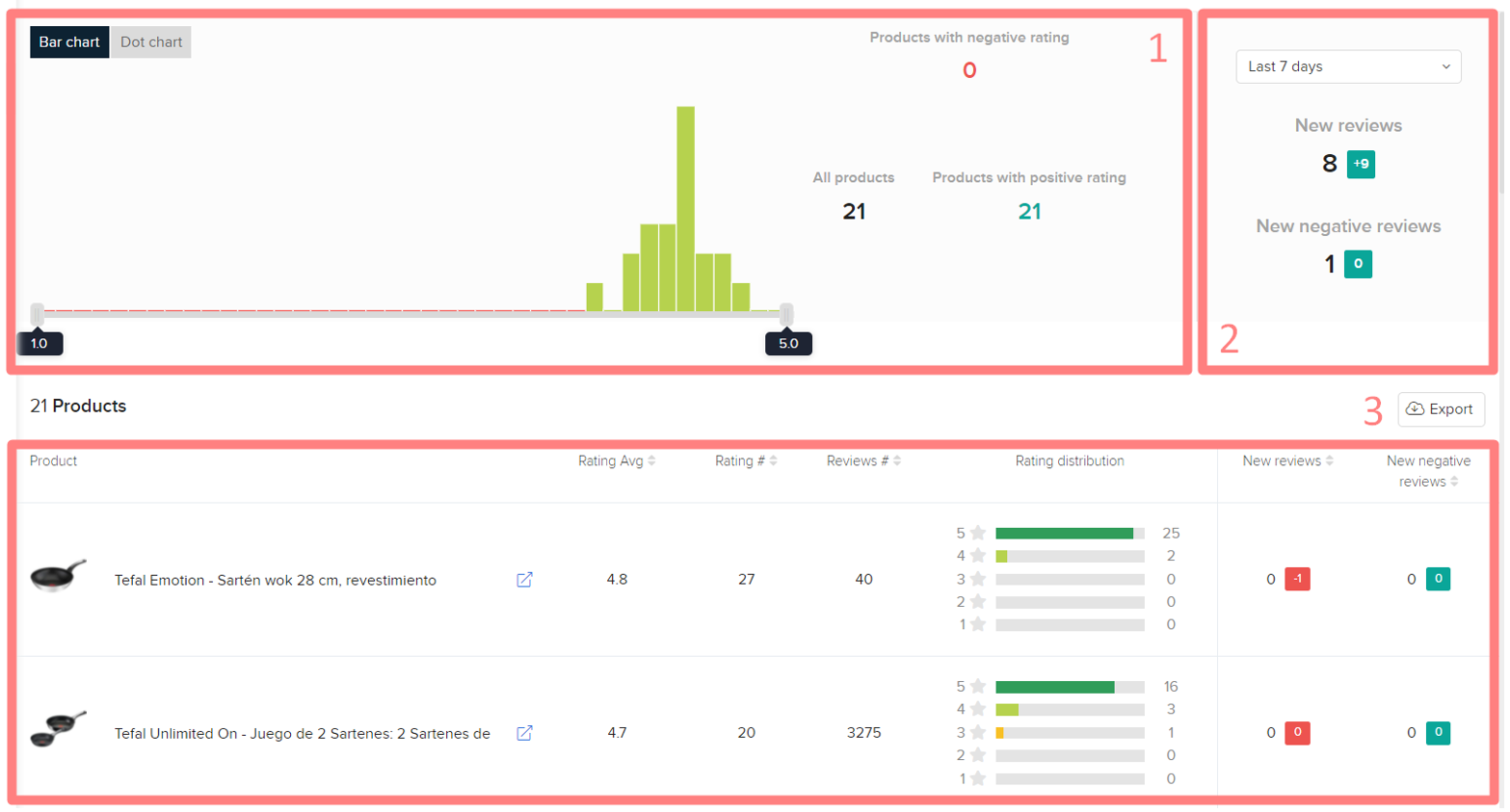 1. 选择条形图或点图来查看你的产品的正面、负面和总评级的一般信息。
