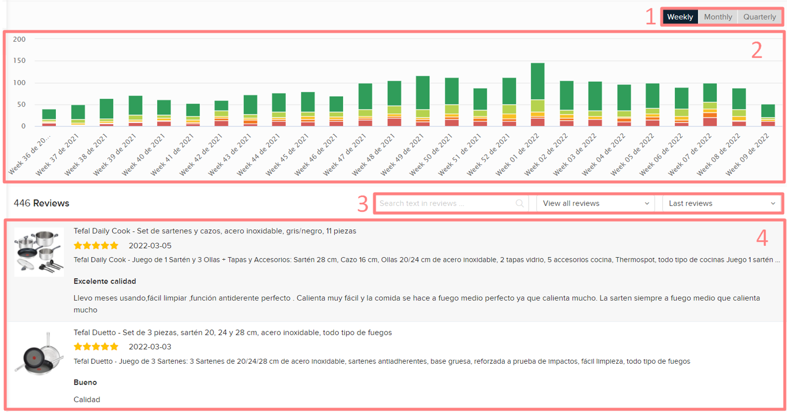 1. 一个条形图,显示在特定期间的评论数量,每个评级有不同的颜色,从0到5。您可以在每周、每月或每季度之间切换以改变分布。