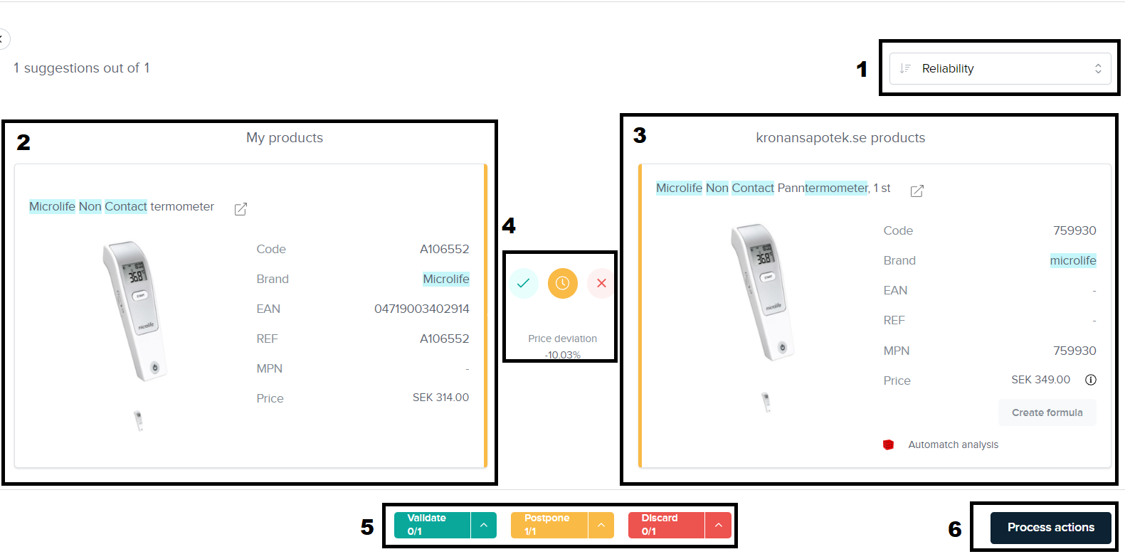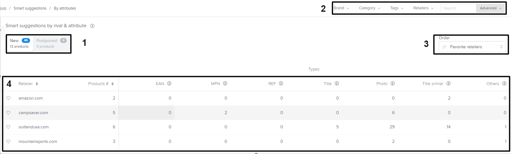 此选项将建议您的目录中的一个产品与竞争对手的一个特定产品进行比较。如果您考虑批量连接您的产品,这是一个好选择。要评估的信息显示在下面的网格中: