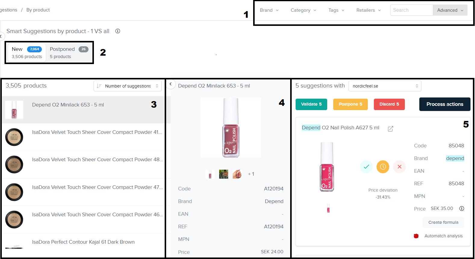 - 特定零售商的建议:从顶部的下拉菜单中选择您希望建立连接的零售商/卖家。在绿色中突出显示的是匹配的信息。验证,推迟或丢弃这些基于找到的匹配元素的连接。此外,您可以建立公式,以防您想要修改竞争对手的价格,即产品是包装,捆绑或一套。