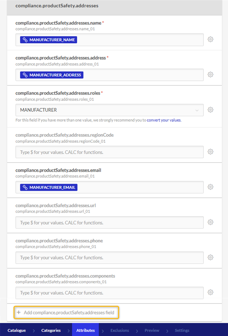 - "compliance.productSafety.addresses.roles":选择"MANUFACTURER"或"DISTRIBUTOR"。这个属性是新的并且是必填的,确保你选择了一个值。至少要指定一个分销商。