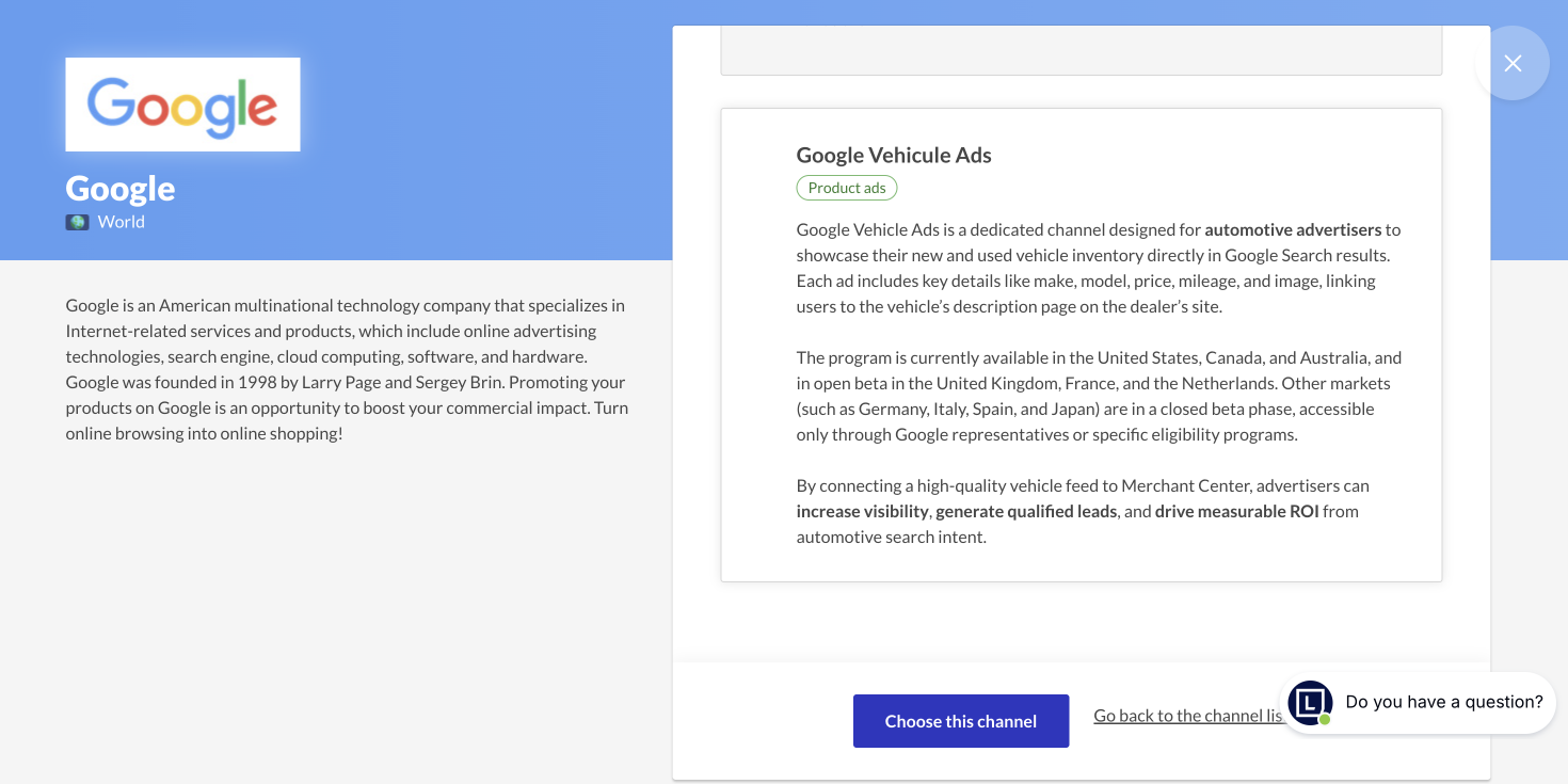 您有一个Lengow账户,可以访问Google Vehicle Ads频道。