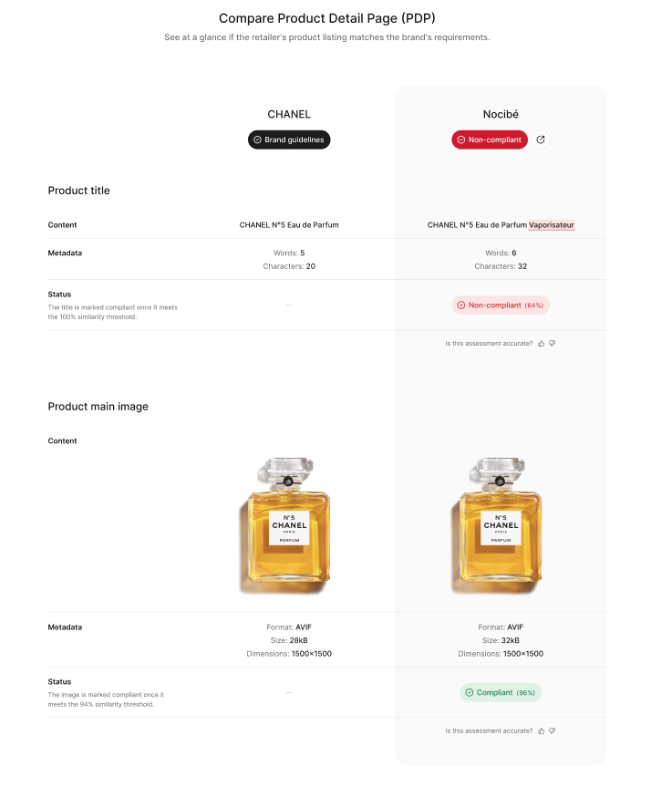 比较产品详细页面(PDP)是最详细的审计级别。它允许您直接进行官方品牌要求与零售商网站上的实时列表之间的技术评估。
