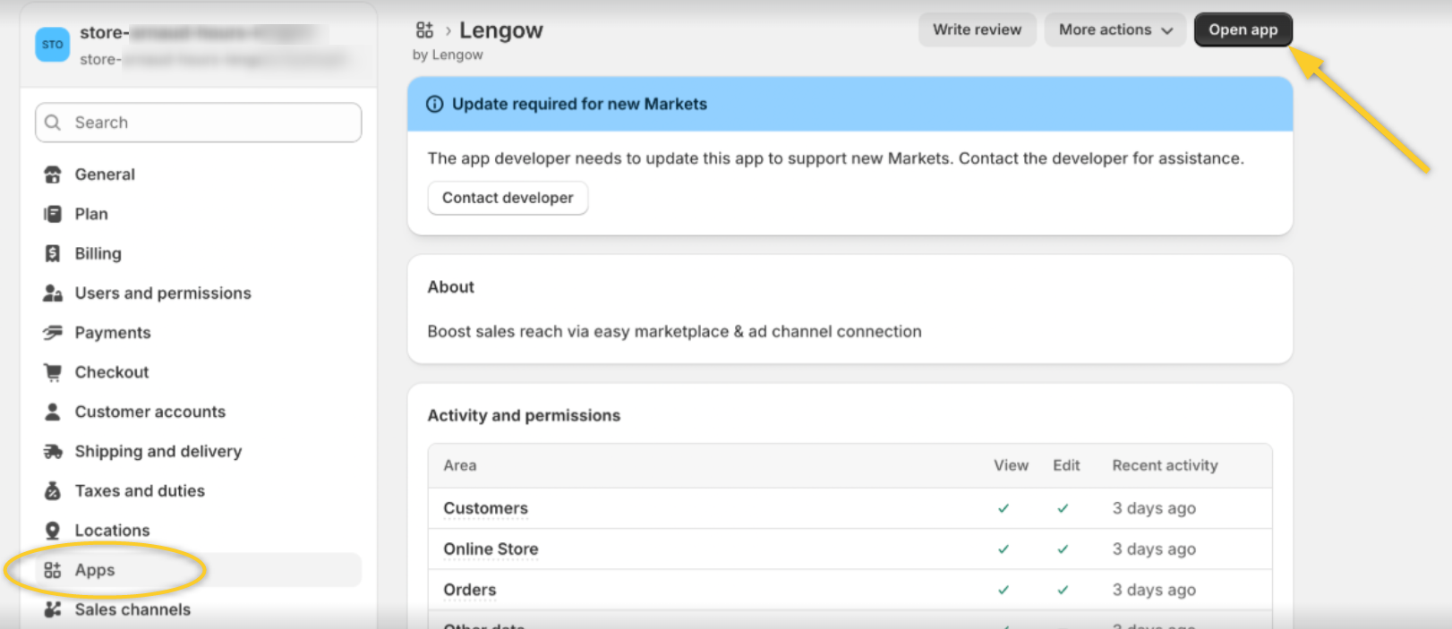 转到您的Shopify管理员>设置>应用程序和销售渠道。从列表中选择Lengow。您将看到一个蓝色的横幅,上面写着"需要更新新的市场"。