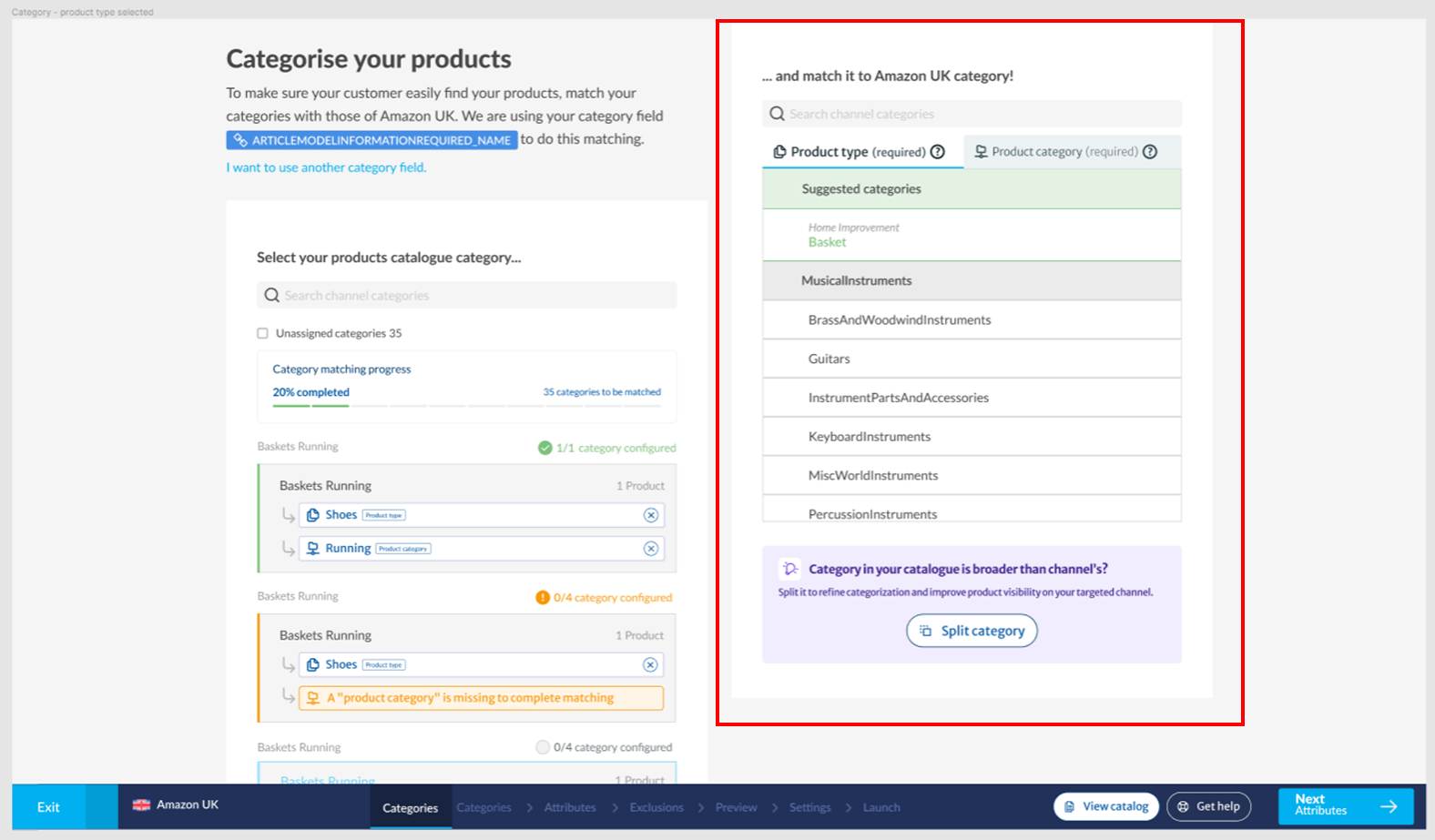 在 "类别匹配"中,"类别建议"通过建议可能匹配到您目录类别的渠道类别来简化此步骤。
